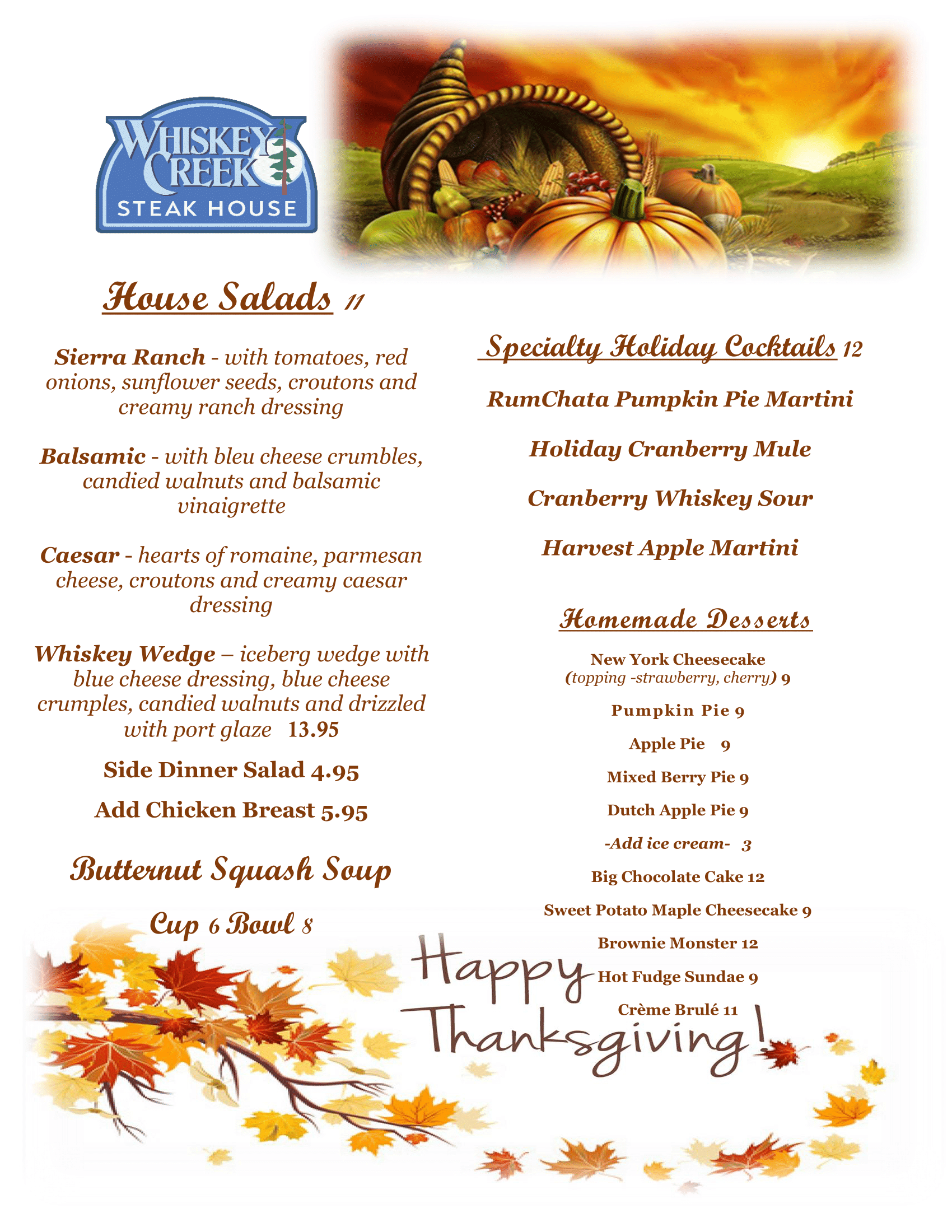 We feature traditional American fare and specialize in freshly baked breads, homemade soups, scrumptious salads, thick steaks, slow-roasted prime rib and authentic western barbecue. And a fully licensed saloon features our micro-brewed beers and a full selection of liquor.